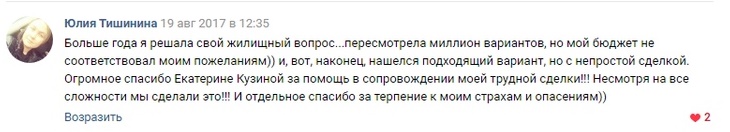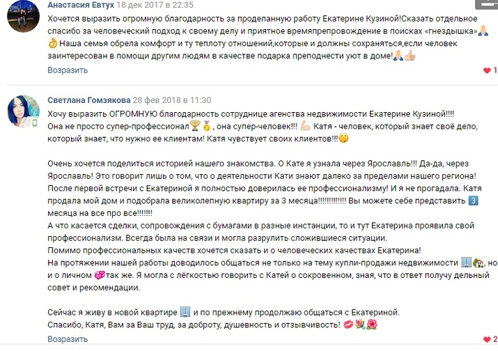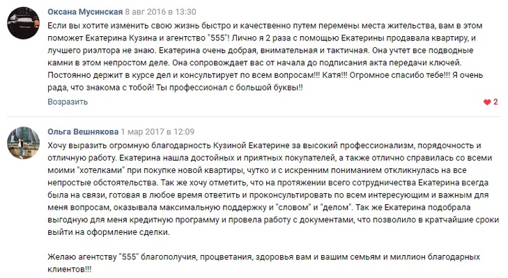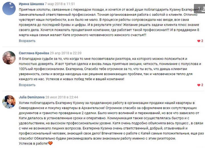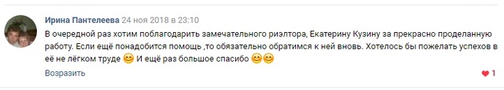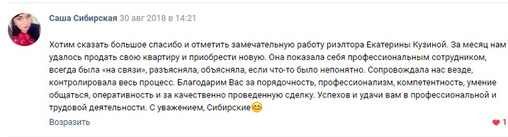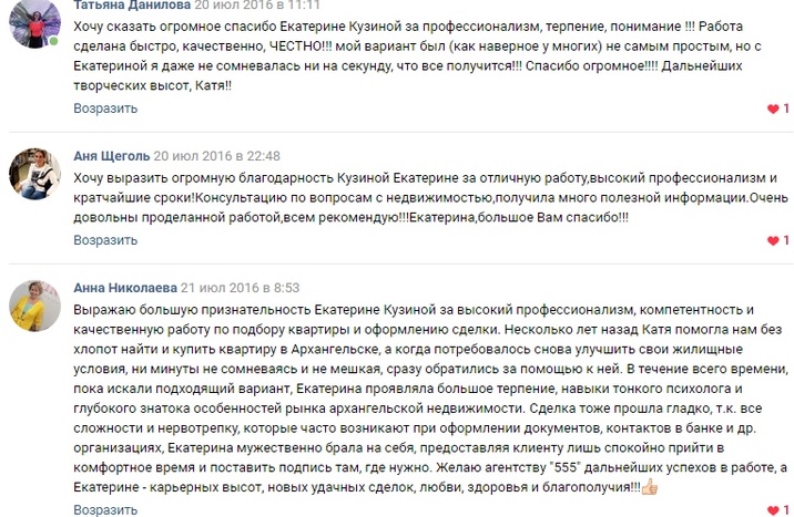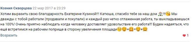 Хочу поблагодарить Кузину Екатерину, за её профессионализм, уже не в первый раз она помогает с продажей квартиры. Сама я живу в другом городе и лишний раз не могу приехать,т.к нахожусь далеко от Архангельска. Она всё организовала, договорилась с опекой,т.к у меня был собственником несовершенно летний ребёнок, показ квартиры. Она хороший специалист своего дела. Даже приобретая жильё в другом городе звоню ей с консультацией, всегда готова помочь. Рекомендую. Кузина Екатерина лучший риэлтор Архангельска.