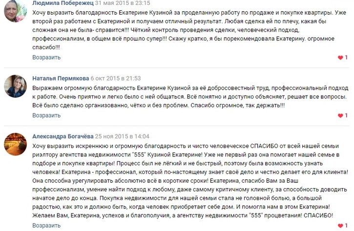 К Екатерине обращаюсь уже не первый раз. При работе хочу отметить профессионализм, лёгкое отношение к клиенту. Объясняет все на пальцах, все этапы сделки предусматривает и сопровождает сама, всегда обо всем предупредит и подскажет.