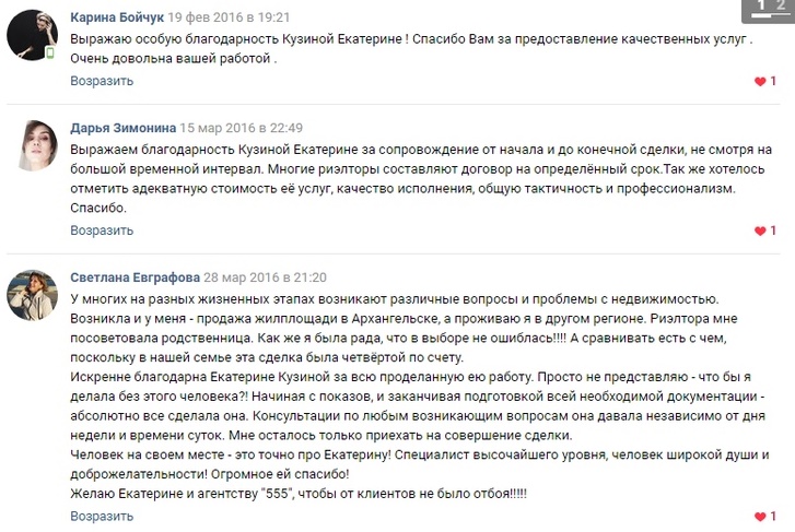 Екатерина, супер специалист по услугам продажи и поиска недвижимости в Архангельске.С Екатериной довелось сотрудничать дважды. И в обоих случаях все было сделано просто на высшем уровне. В дальнейшем сотрудничать по всем вопросам с недвижимостью буду только с ней.